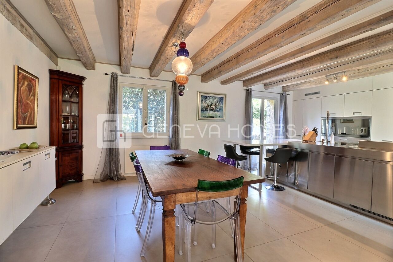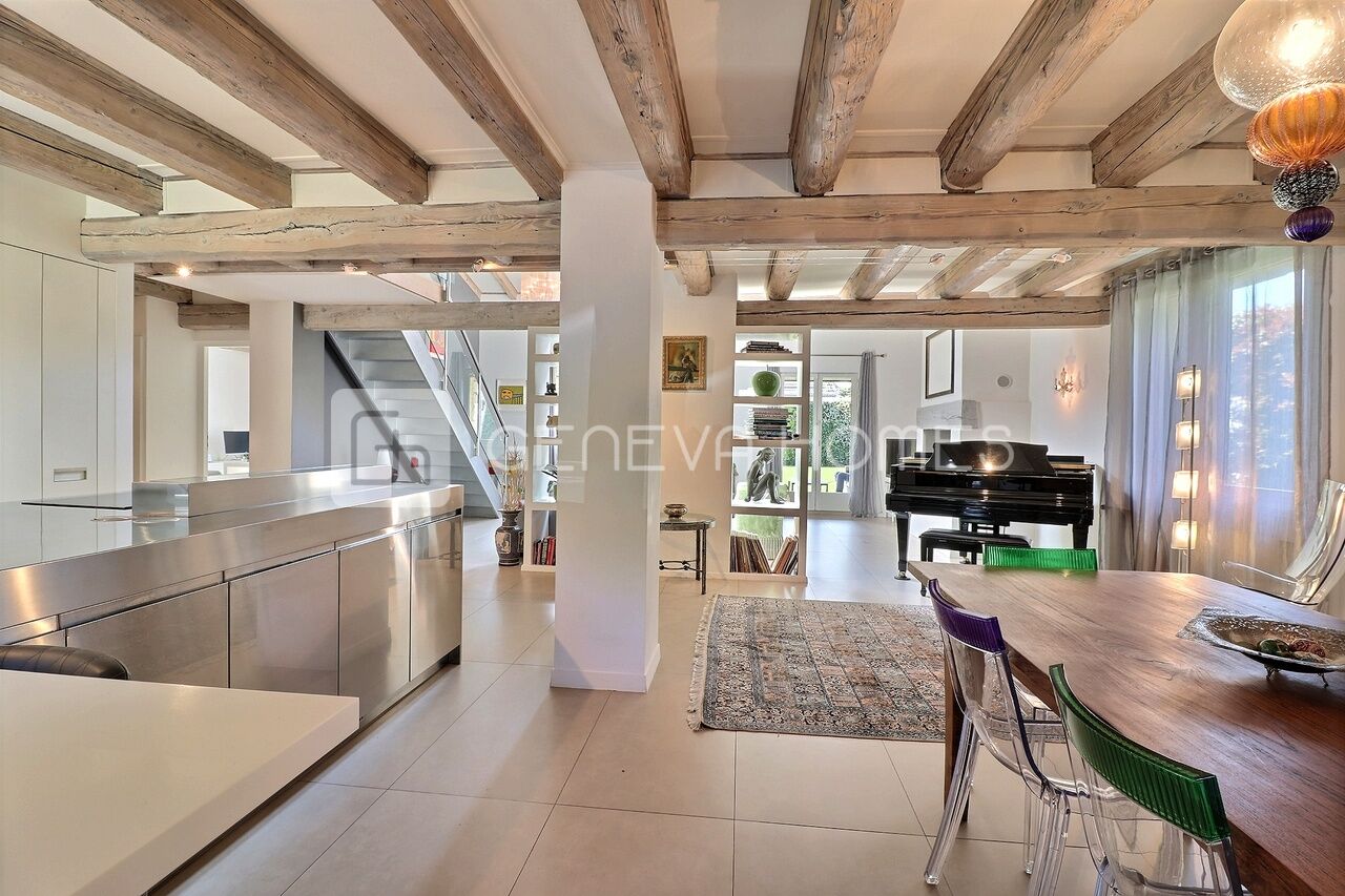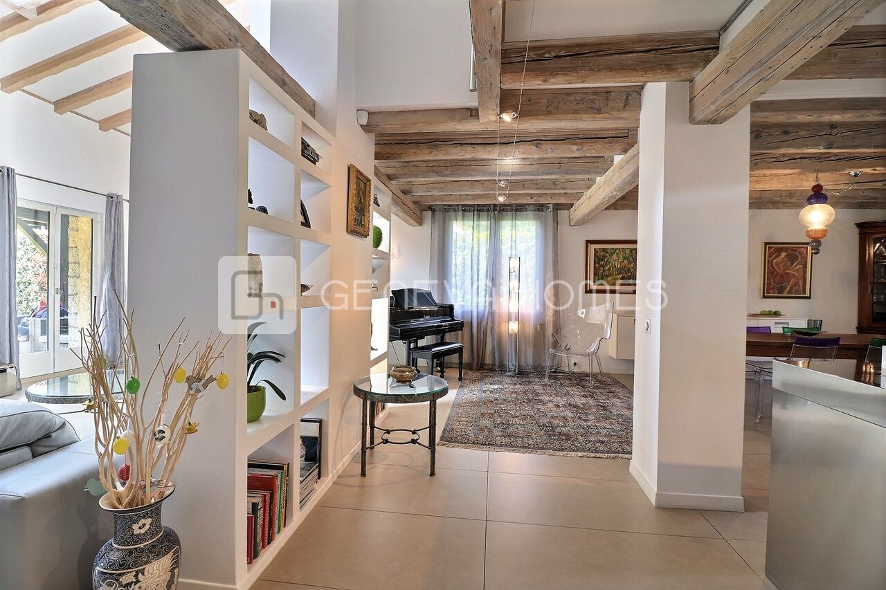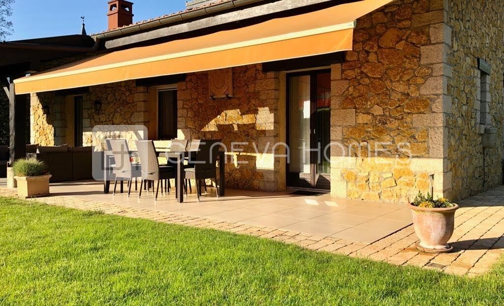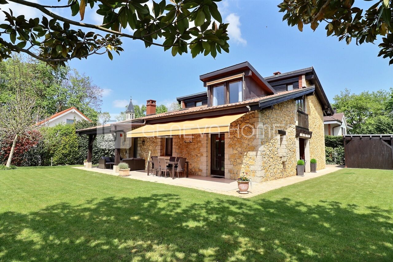 This splendid stone villa with contemporary interior is located in the residential community of Veyrier.Located at the end of a cul-de-sac, surrounded by calm, green countryside and close to the vineyards, the house enjoys a beautiful view of the Saleve, is at walking distance from the village, shops, schools and only 15 min from the centre of Geneva (bus stops of lines 8, 41 and 34 at 150m).