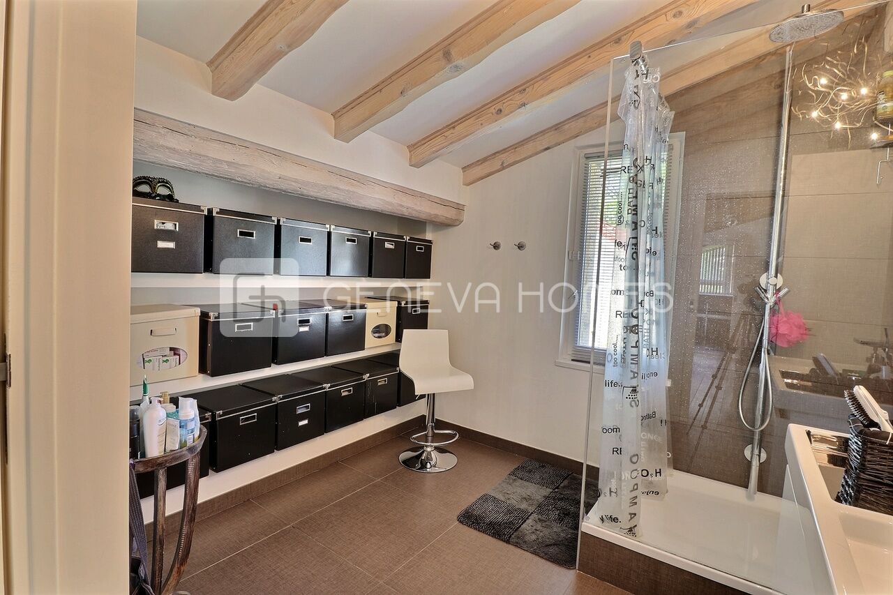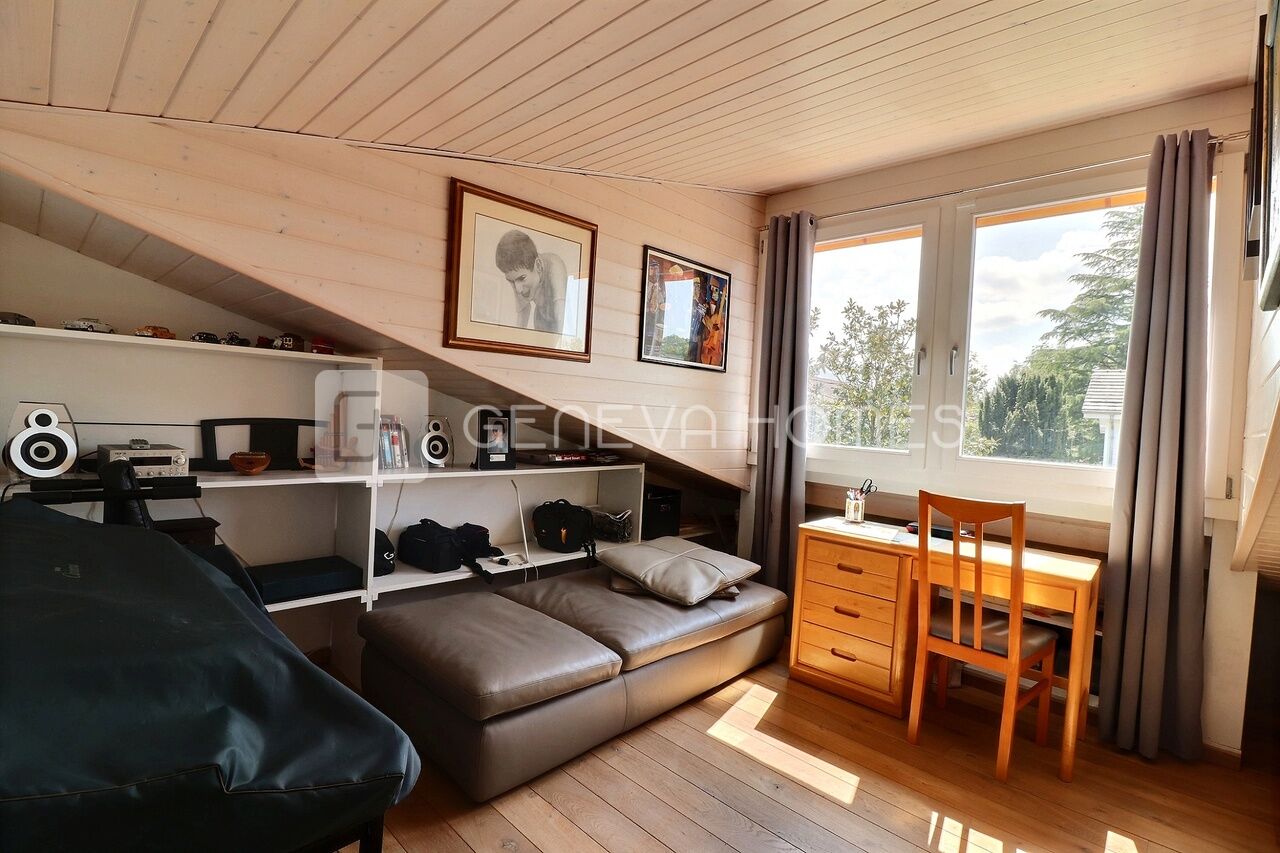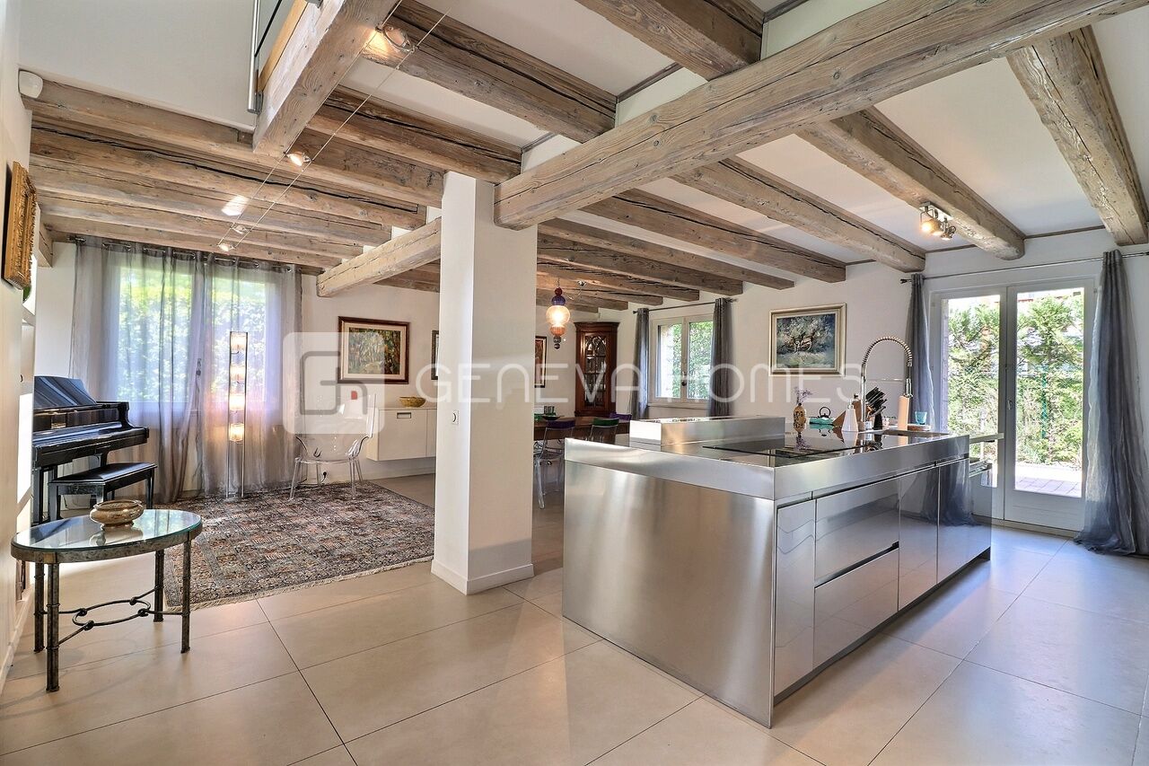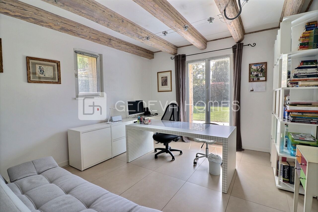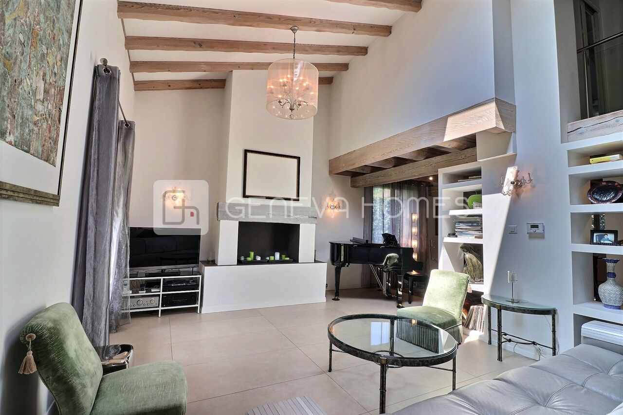 This splendid stone villa with contemporary interior is located in the residential community of Veyrier.Located at the end of a cul-de-sac, surrounded by calm, green countryside and close to the vineyards, the house enjoys a beautiful view of the Saleve, is at walking distance from the village, shops, schools and only 15 min from the centre of Geneva (bus stops of lines 8, 41 and 34 at 150m).