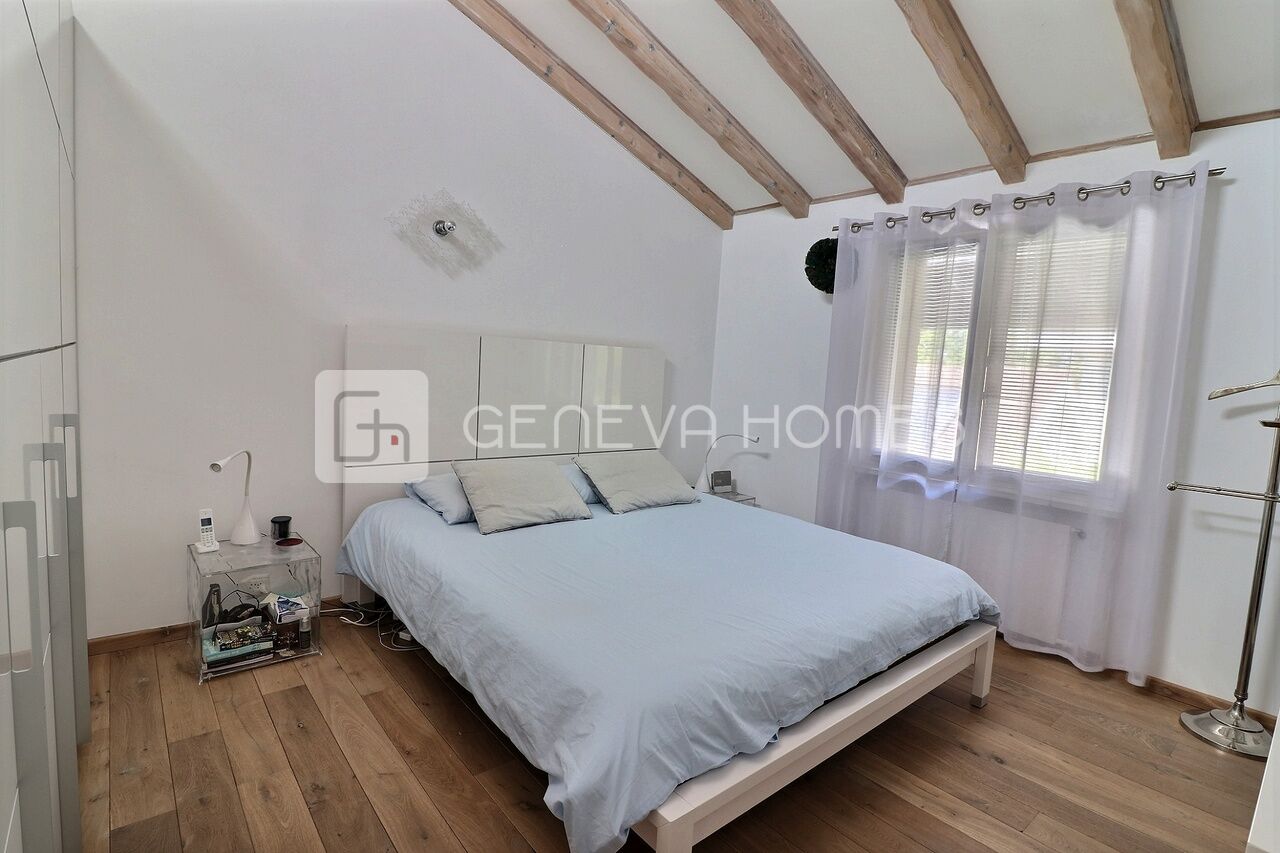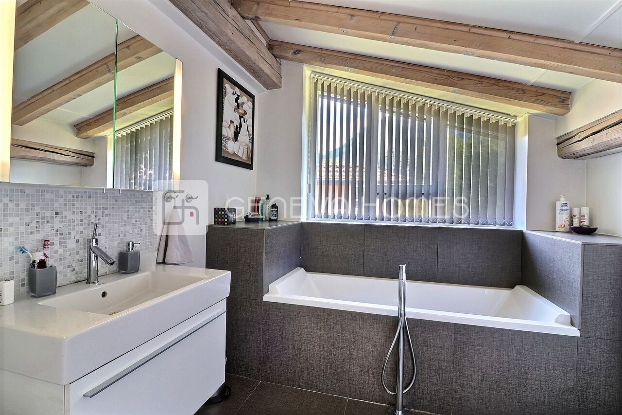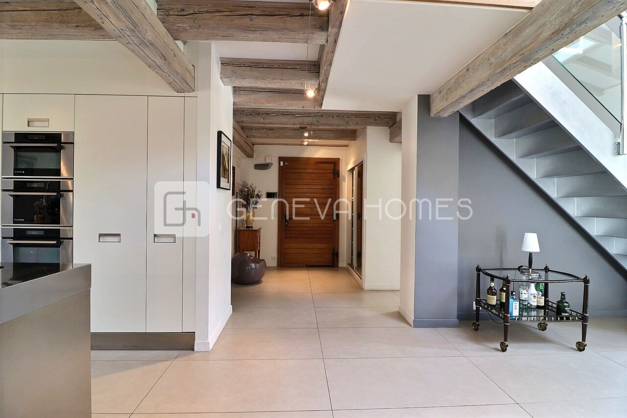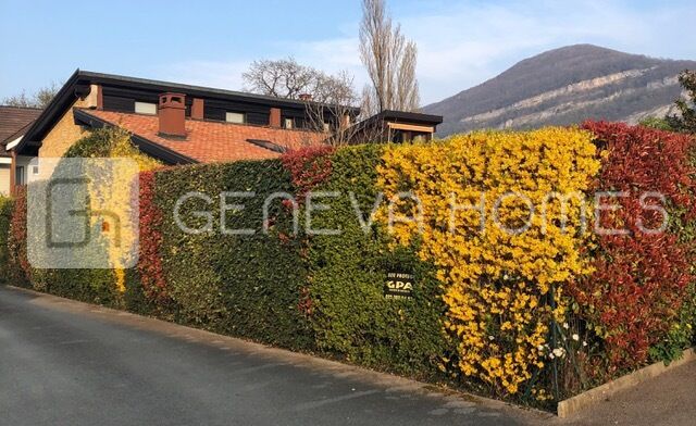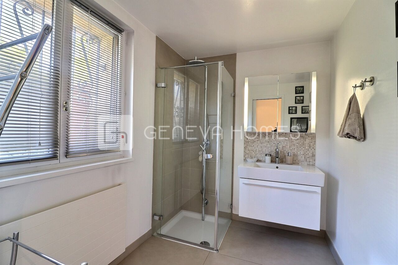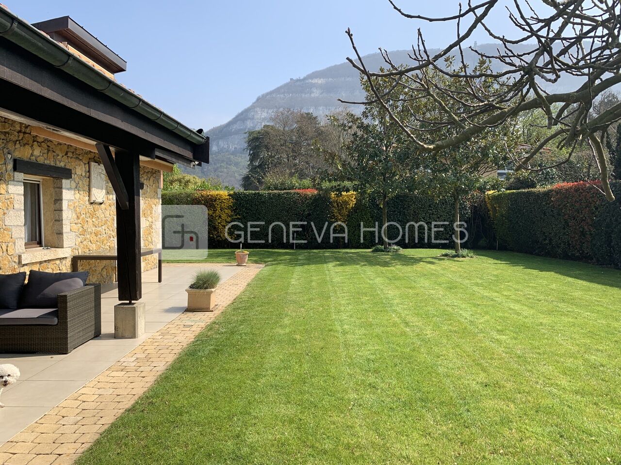 This splendid stone villa with contemporary interior is located in the residential community of Veyrier.Located at the end of a cul-de-sac, surrounded by calm, green countryside and close to the vineyards, the house enjoys a beautiful view of the Saleve, is at walking distance from the village, shops, schools and only 15 min from the centre of Geneva (bus stops of lines 8, 41 and 34 at 150m).