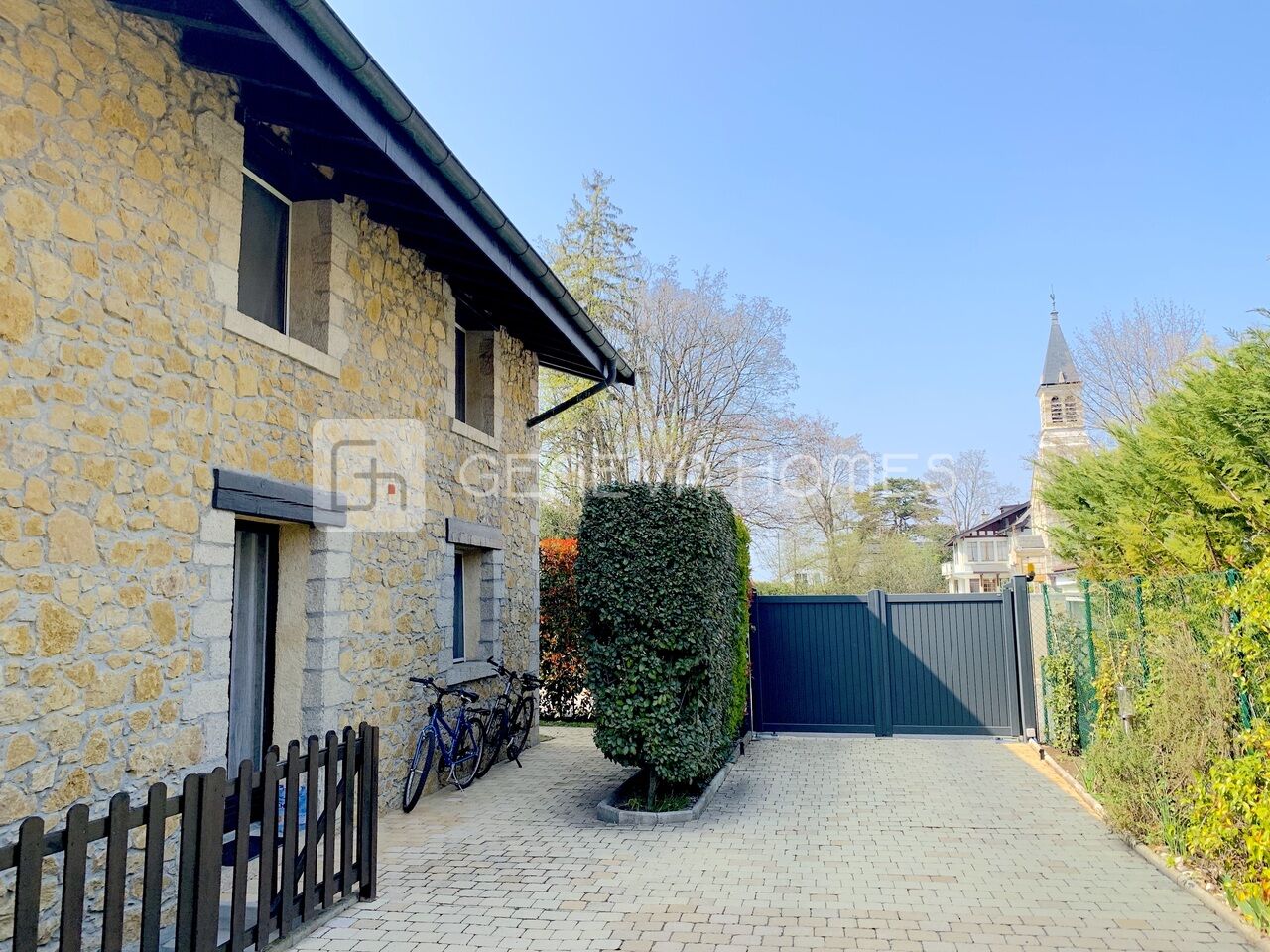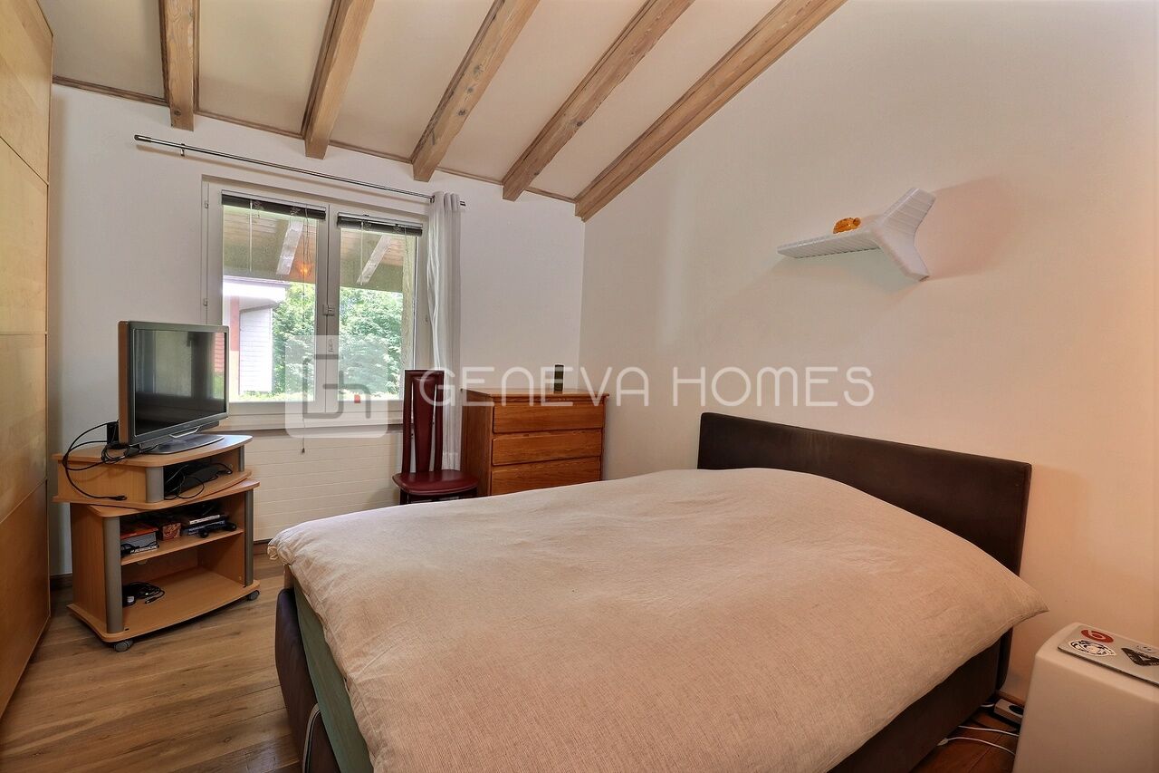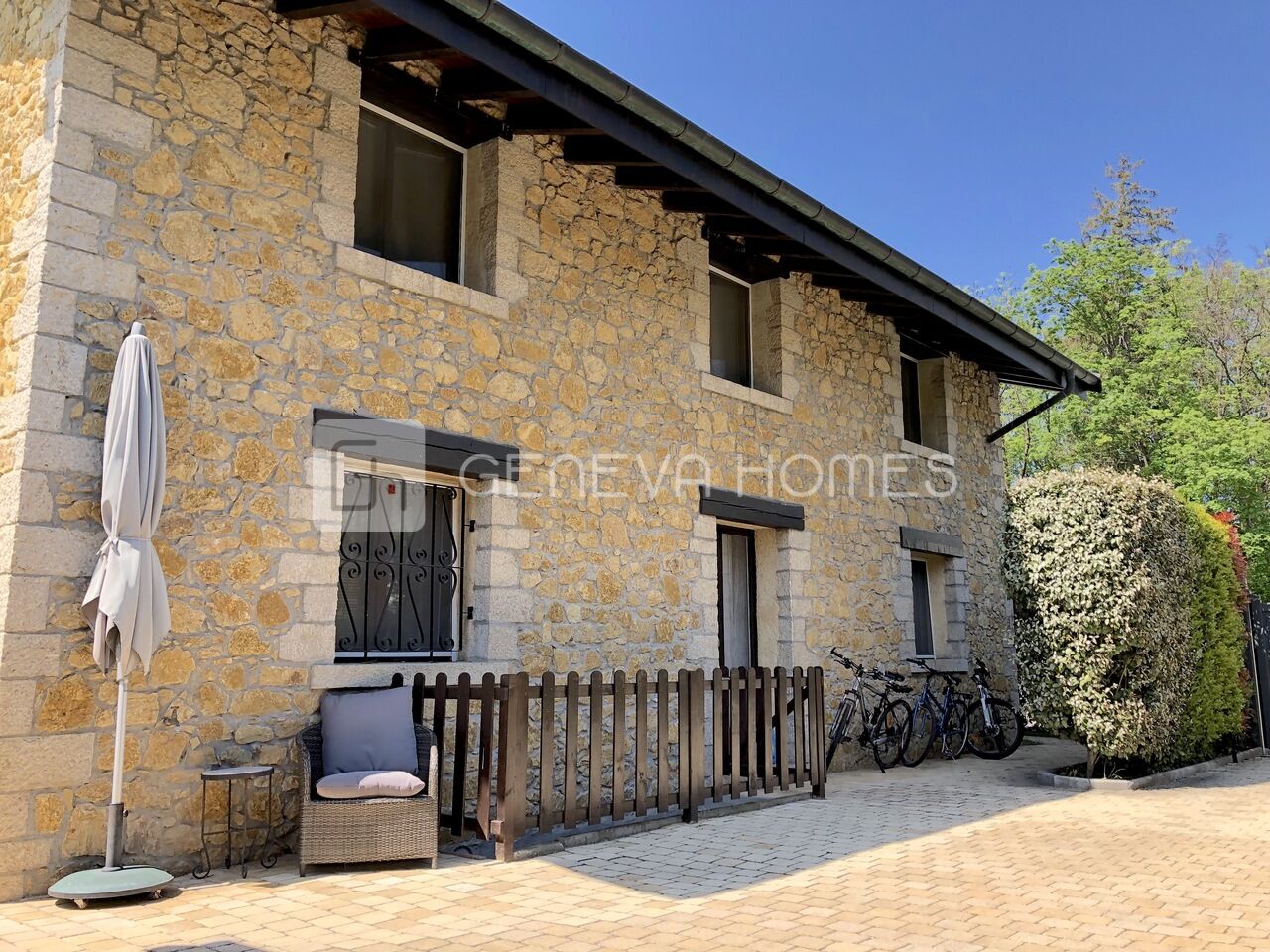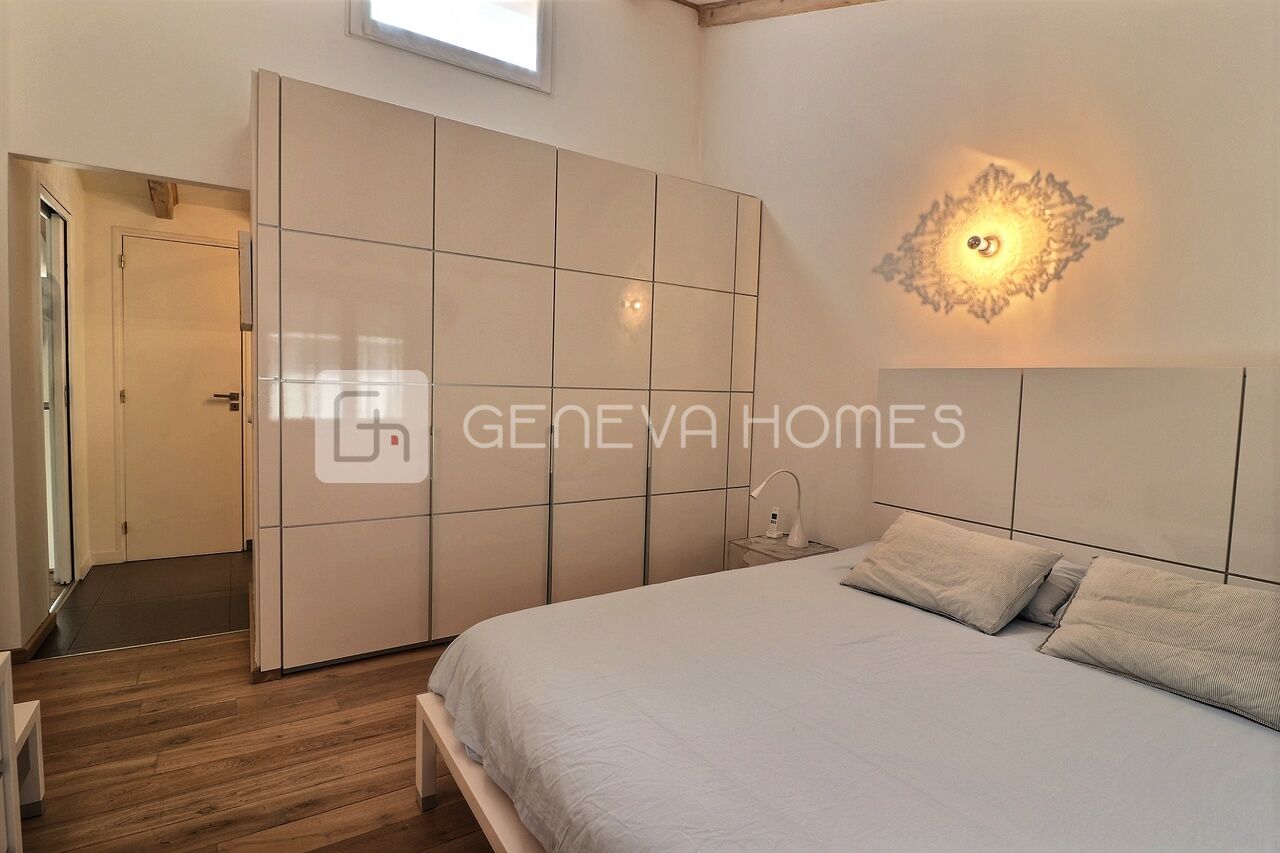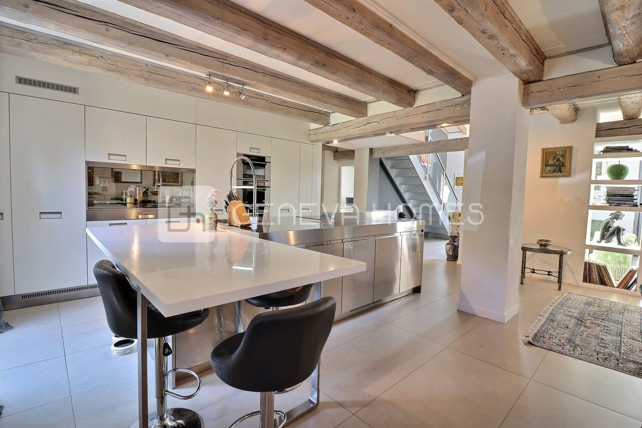 This splendid stone villa with contemporary interior is located in the residential community of Veyrier.Located at the end of a cul-de-sac, surrounded by calm, green countryside and close to the vineyards, the house enjoys a beautiful view of the Saleve, is at walking distance from the village, shops, schools and only 15 min from the centre of Geneva (bus stops of lines 8, 41 and 34 at 150m).