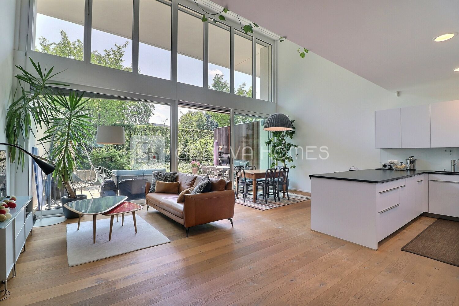 - Grand séjour avec double hauteur de plafond (6mts) et grandes baies vitrées avec triple vitrage ;