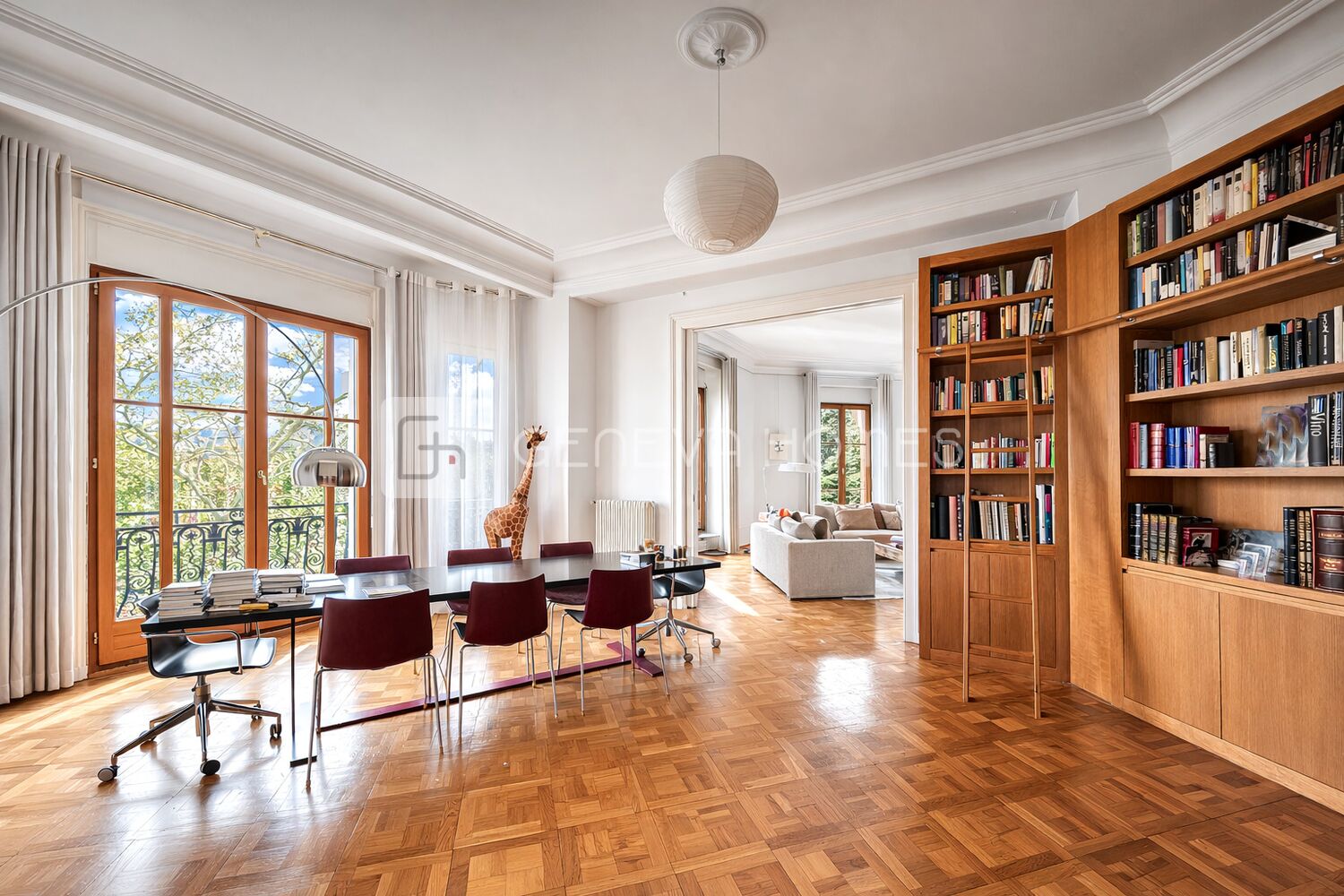 - Trois grandes pièces en enfilade avec de très hauts plafonds et de magnifiques moulures, dont une de pièce est aménagée en bibliothèque.